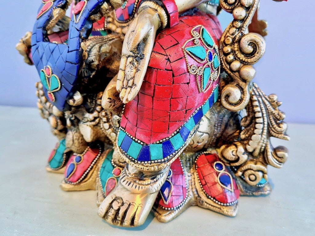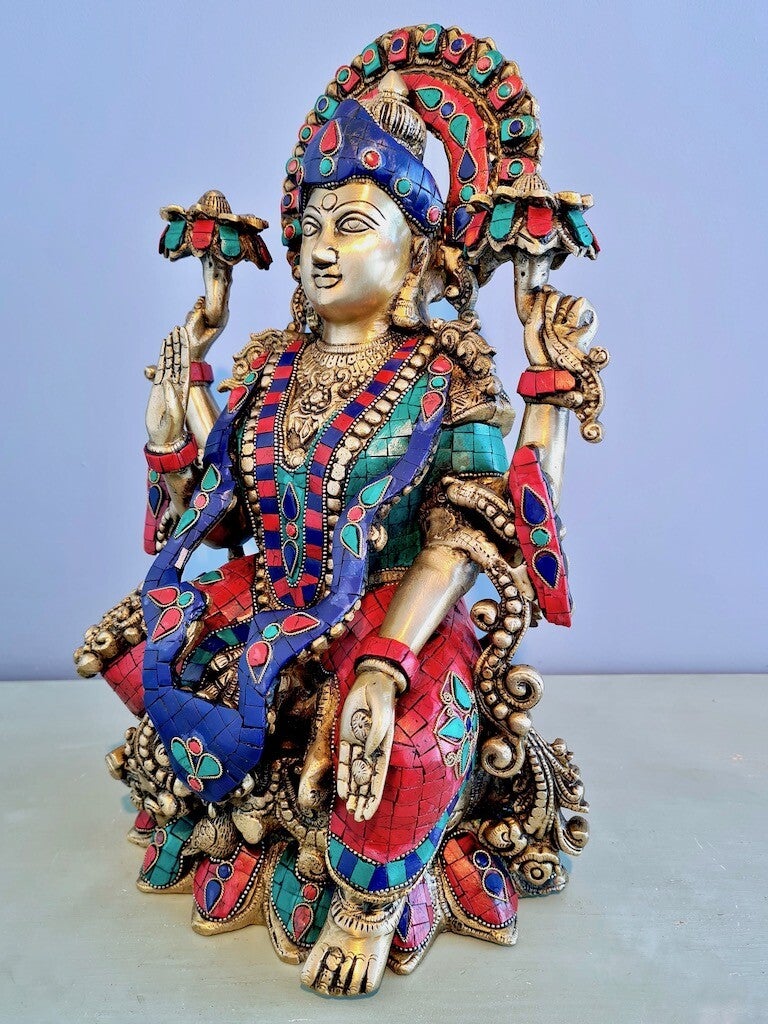 In tegenstelling tot Saraswati, is Lakshmi meestal afgebeeld met veel rijke sieraden, veel goud en veel geld.