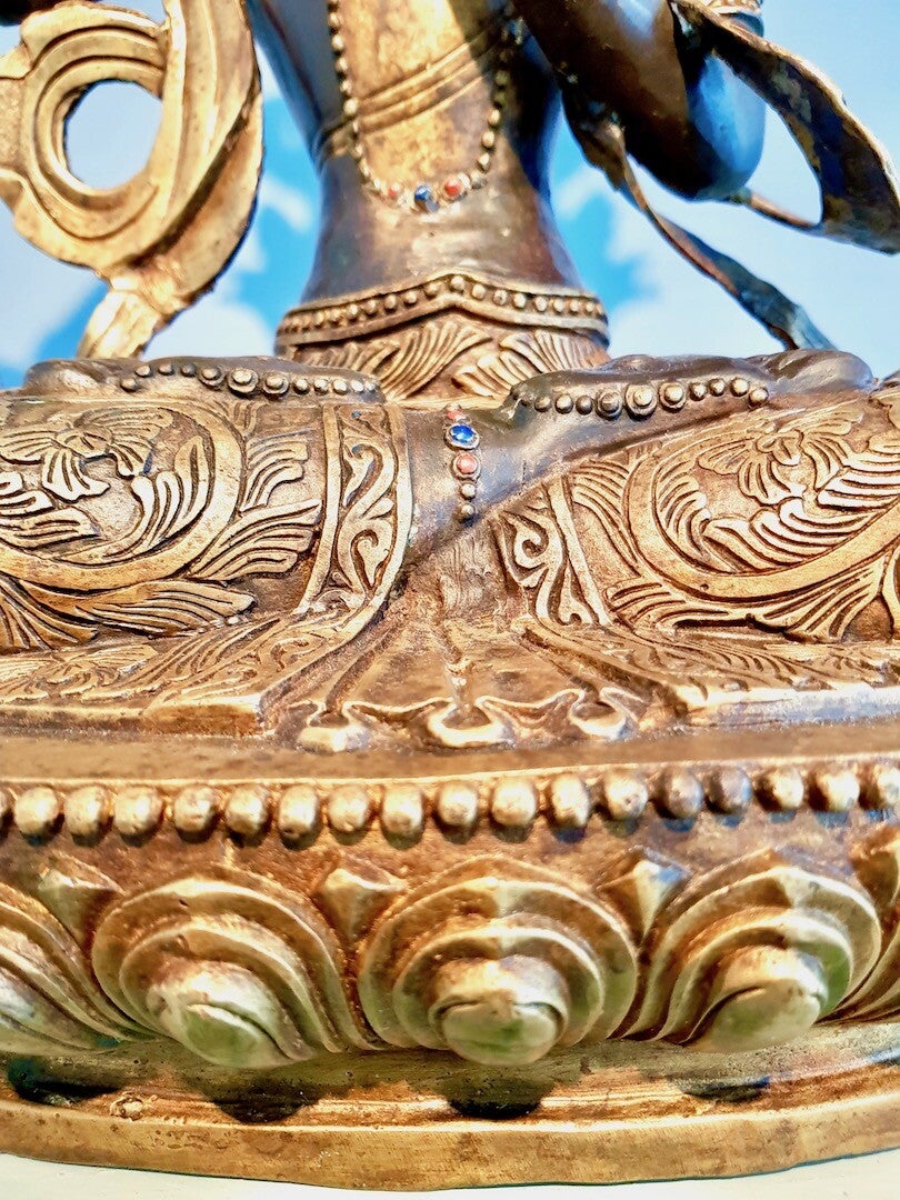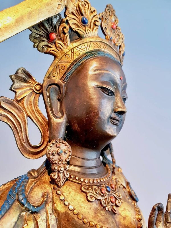 Serene gelaatsuitdrukking, de gewilde zogenaamde downcast eyes under arched eyebrows. Het figuur is gedetailleerd uitgewerkt en nageciselleerd. Dit betreft een zeer hoge kwaliteit Nepalees beeld. De onderkant is verzegeld met koperen plaat.