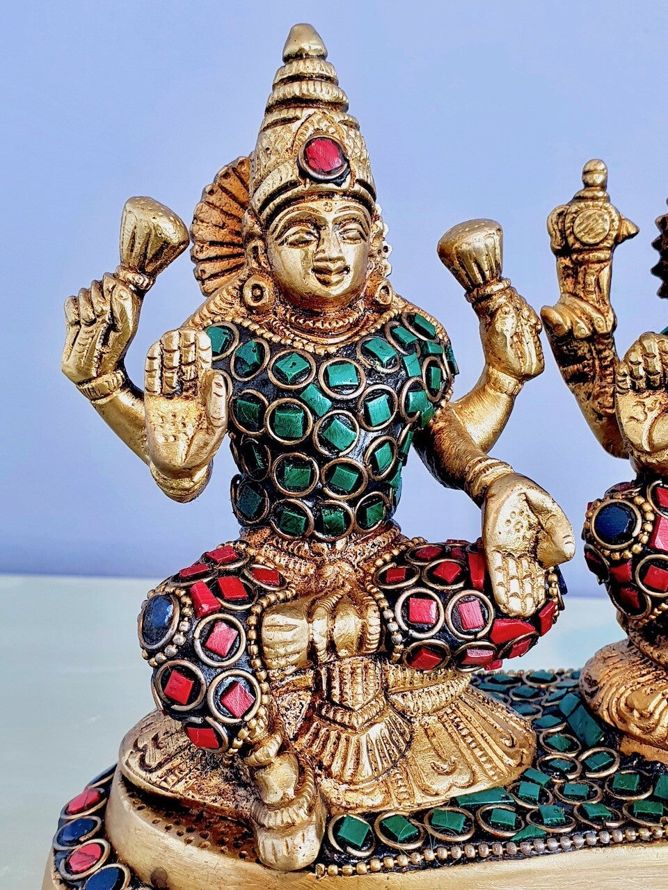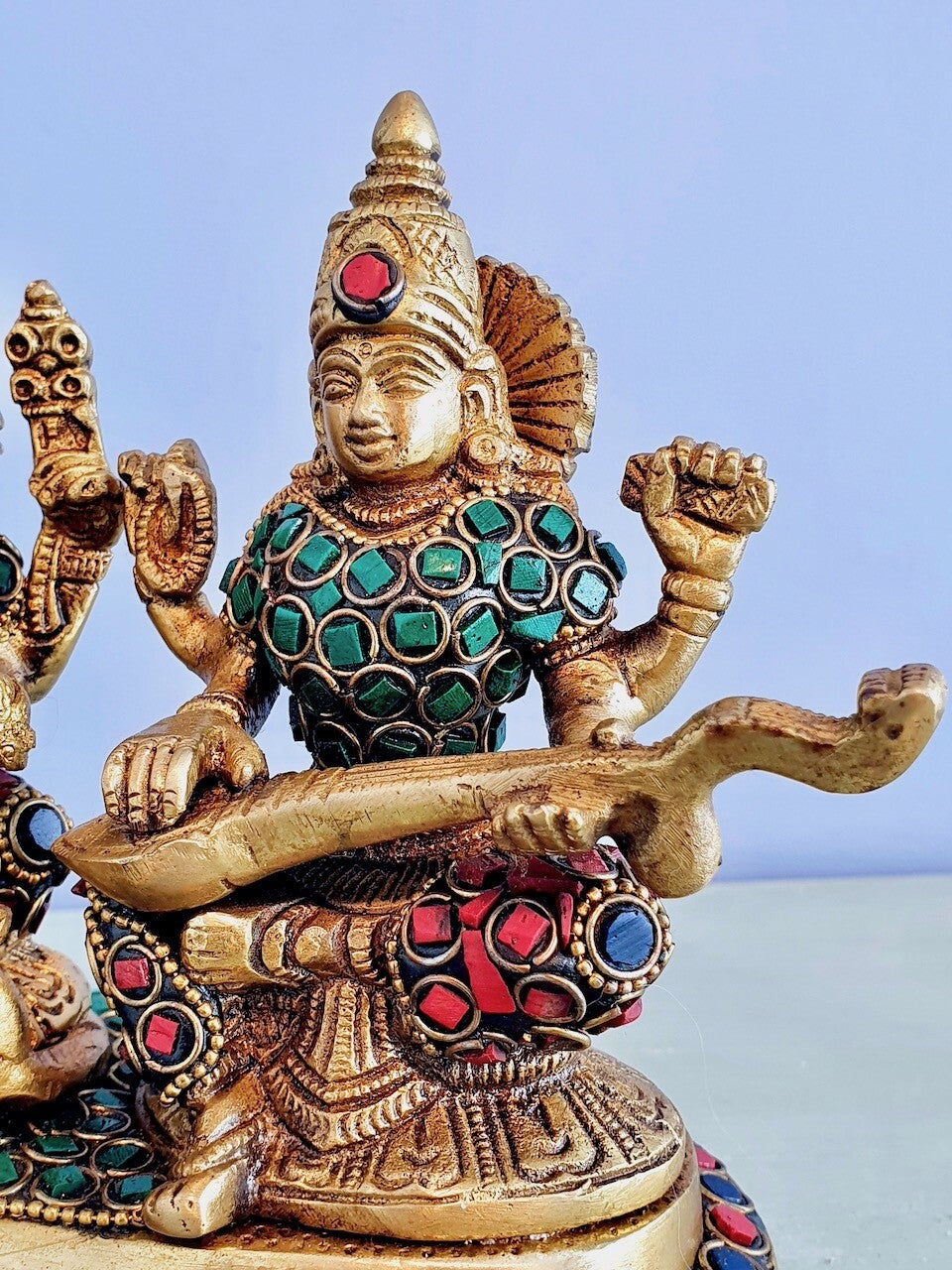 Gezamenlijk op een sierlijk plateau zitten van links naar rechts: Lakshmi, Ganesha en Sarasvati als eenheid afgebeeld. Dit bijzondere beeld heeft een zware kwaliteit brons en is door kunstenaars afgewerkt met de nieuwste style accessoires!
