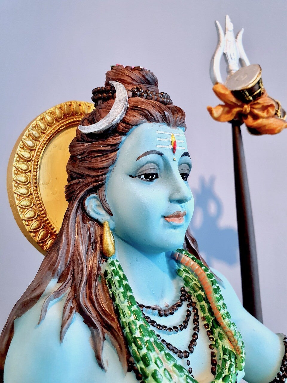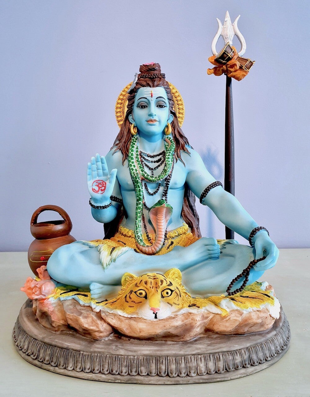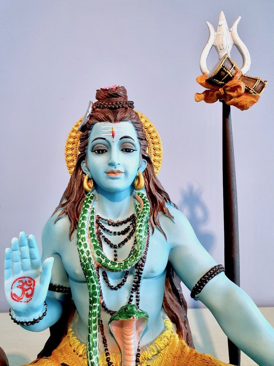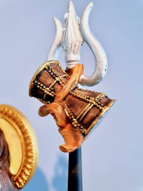 De damru/drum (onder de trishul) is links zichtbaar, die Nada symboliseert, de kosmische AUM die trilt door alles wat bestaat. Deze trilling is door Yogi’s waar te nemen; eerst in hunzelf, dan in alles en iedereen om hun heen en uiteindelijk heel de Kosmos.