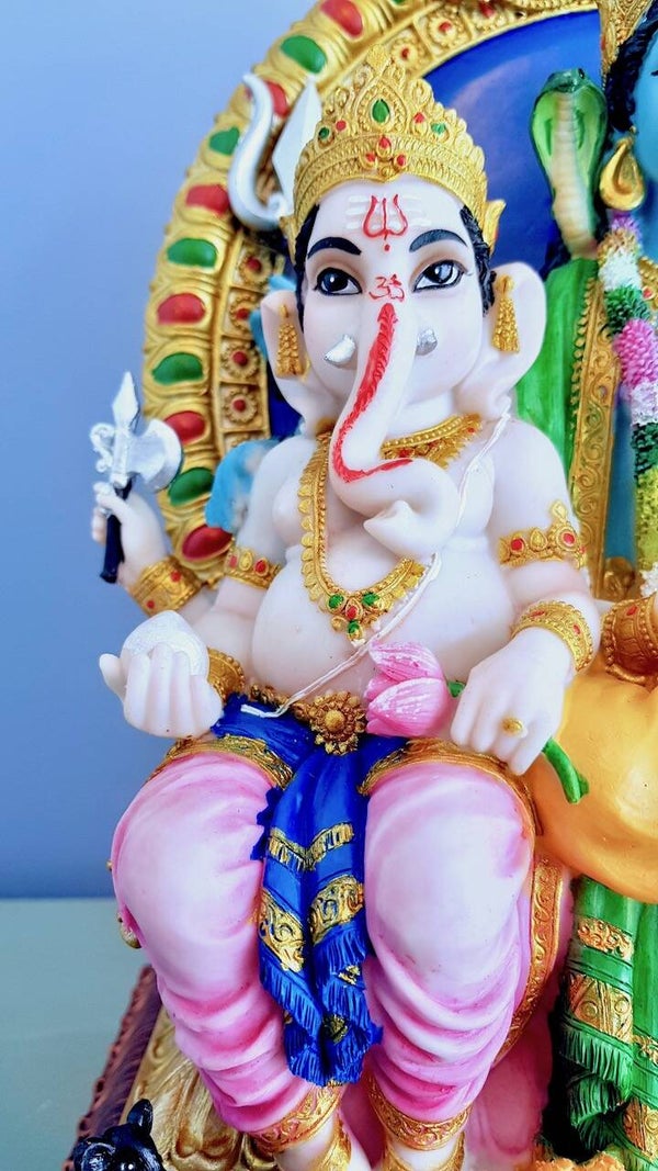 3. Zoals via dit beeld, in een menselijke gedaante, samen met zijn vrouw Parvati. Samen met Shiva symboliseert Parvati de kracht om te creëren en te vernietigen. Alleen al haar aanwezigheid was voldoende om bij Shiva onbeheersbare verlangens los te maken. Zij staat echter ook symbool voor het huwelijk, de gehoorzame vrouw en het leven in Ascese. Parvati is ook de godin van de schoonheid en heeft een bijzonder voluptueuze verschijning.