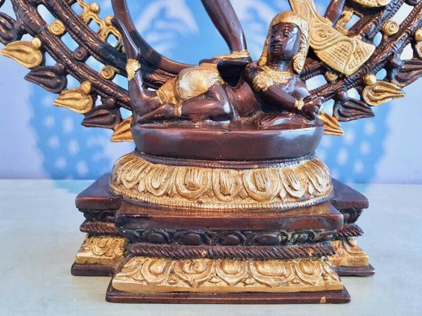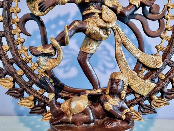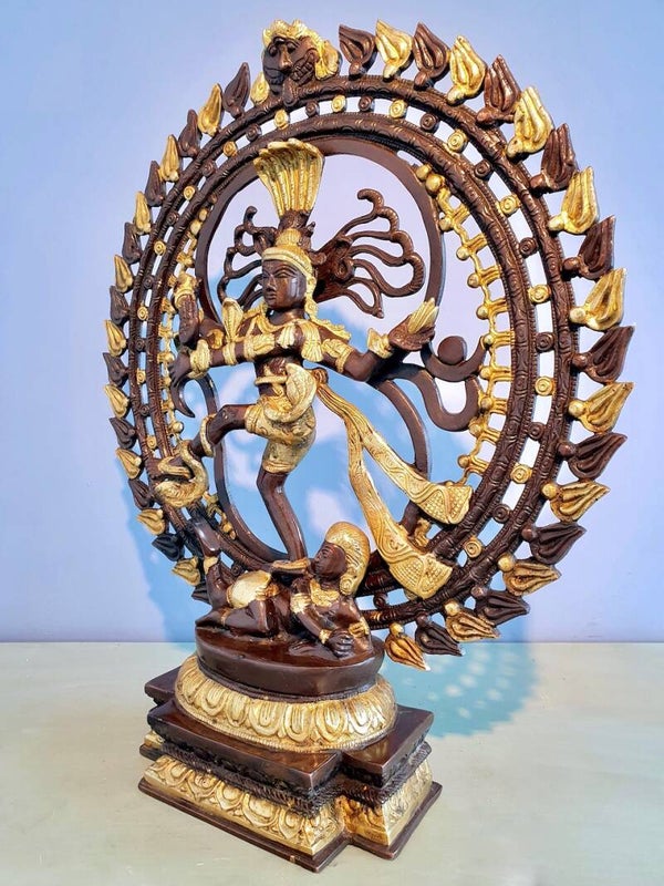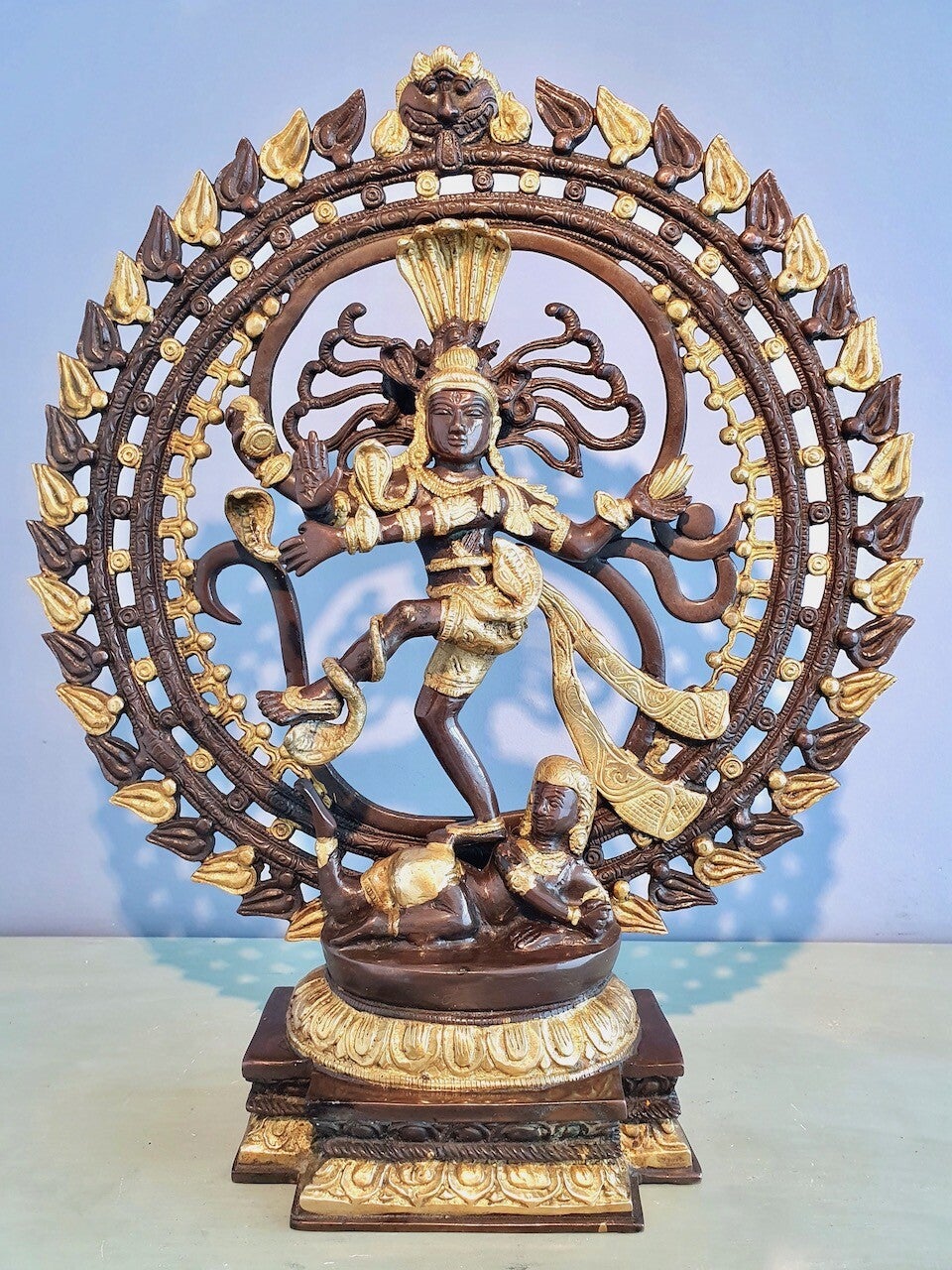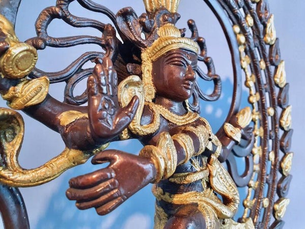 In zijn verste linkerhand houdt hij een vlam: vuur als symbool voor de vernietiging. Zonder vernietiging is geen schepping mogelijk. De tweede rechterhand houdt hij in een geruststellend, groetend handgebaar : de bekende 'Abhaya mudra', "vrees niet": deze symboliseert de instandhouding van de wereld. De tweede linkerhand wijst naar het opgeheven linkerbeen: symbolisch voor de bevrijding van illusie (wanneer God het wil). De vorm van deze arm herinnert tevens aan de slurf van Ganesha en is een symbool van kracht. De vier armen, typisch voor Indische goden, zijn natuurlijk ook symbolisch voor de almacht van Shiva. Onder zijn rechtervoet tenslotte bedwingt hij moeiteloos de dwerg-demon 'Apasmara-Purusha', de 'onwetende' of 'vergeetachtige' ziel.