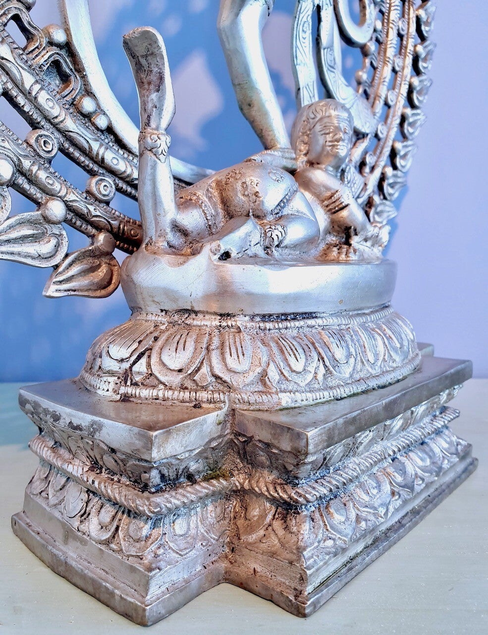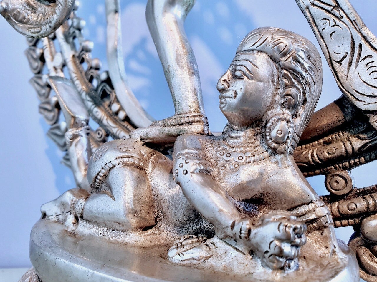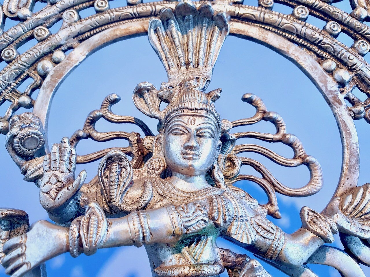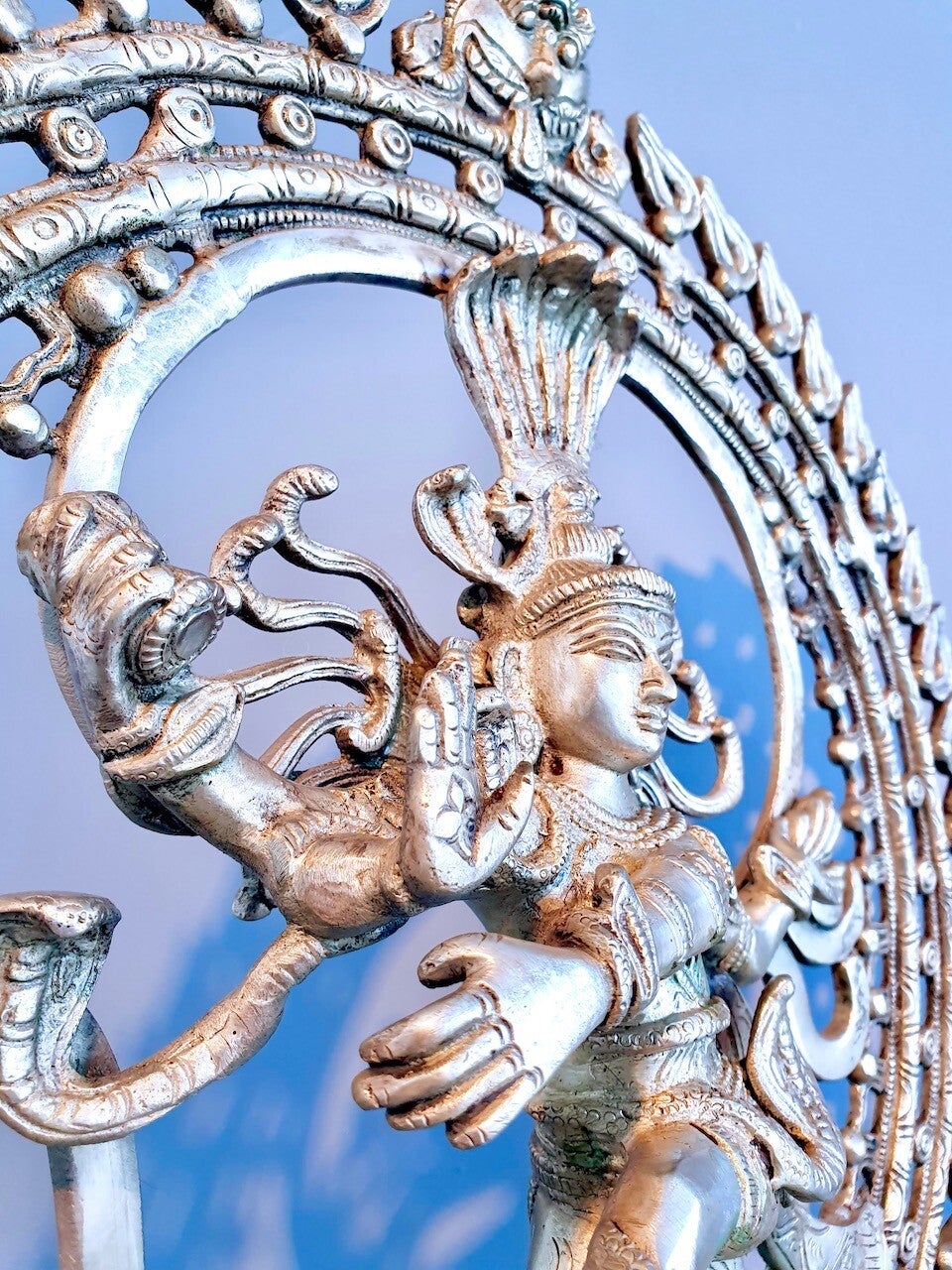 In zijn verste linkerhand houdt hij een vlam: vuur als symbool voor de vernietiging. Zonder vernietiging is geen schepping mogelijk. De tweede rechterhand houdt hij in een geruststellend, groetend handgebaar : de bekende 'Abhaya mudra', "vrees niet": deze symboliseert de instandhouding van de wereld. De tweede linkerhand wijst naar het opgeheven linkerbeen: symbolisch voor de bevrijding van illusie (wanneer God het wil). De vorm van deze arm herinnert tevens aan de slurf van Ganesha en is een symbool van kracht. De vier armen, typisch voor Indische goden, zijn natuurlijk ook symbolisch voor de almacht van Shiva. Onder zijn rechtervoet tenslotte bedwingt hij moeiteloos de dwerg-demon 'Apasmara-Purusha', de 'onwetende' of 'vergeetachtige' ziel.