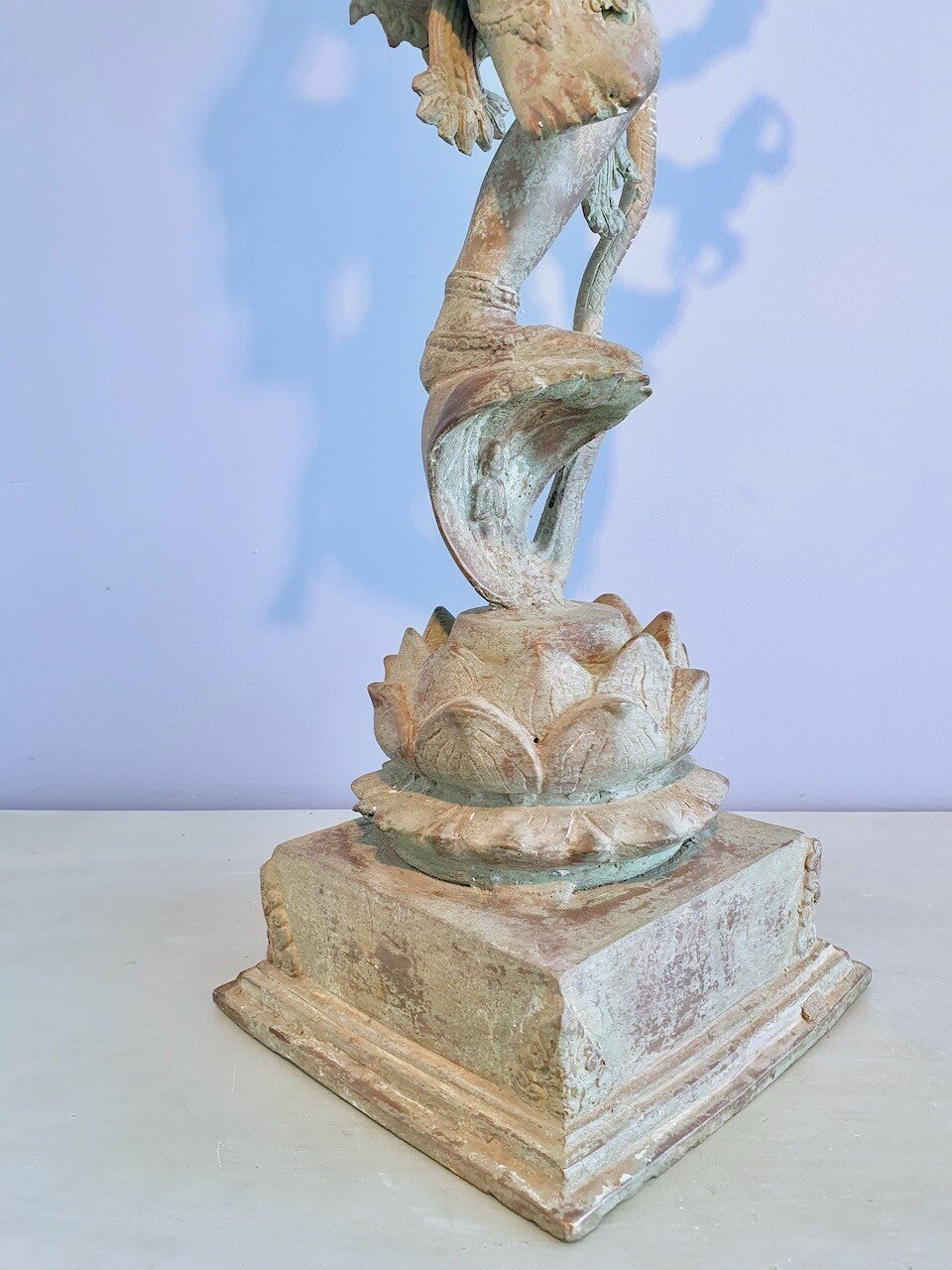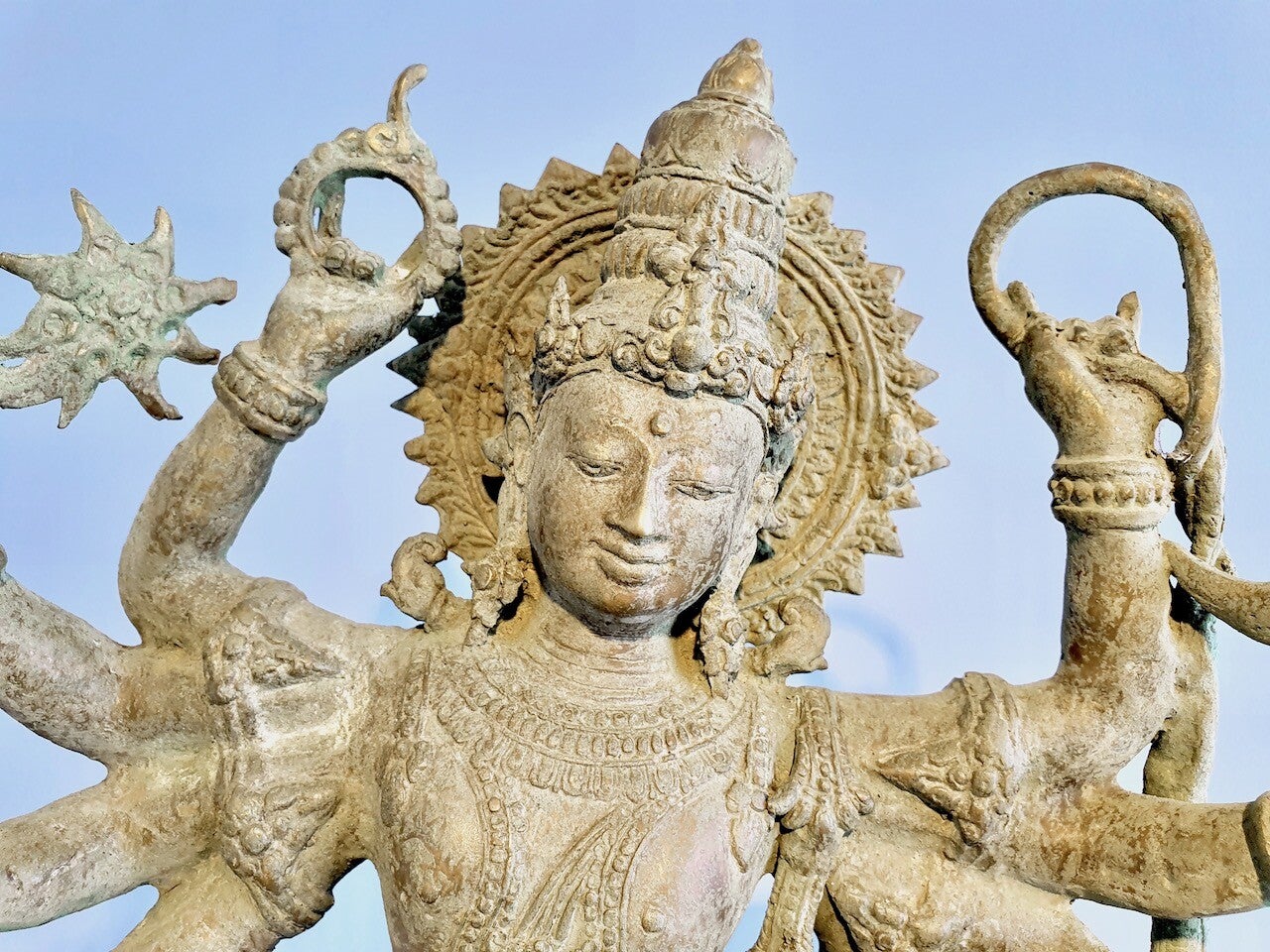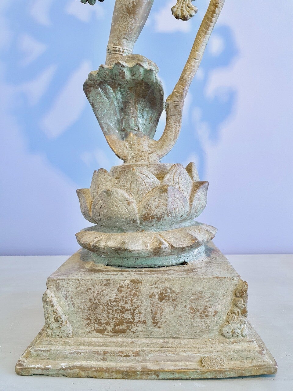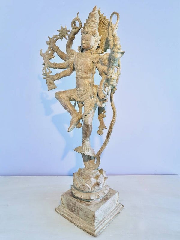 Shiva heeft een warme en open glimlach met een mooie goddelijke halo achter zijn hoofd. Shiva heeft een brons messing basis en bijzondere groene patina. Zijn rechterbeen is verhoogd door zijn dans dat de sculptuur een verfijnde uitstraling geeft. Een prachtige voorstelling van Lord Shiva wat ons betreft!