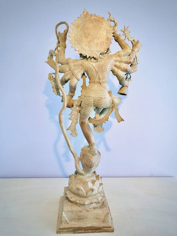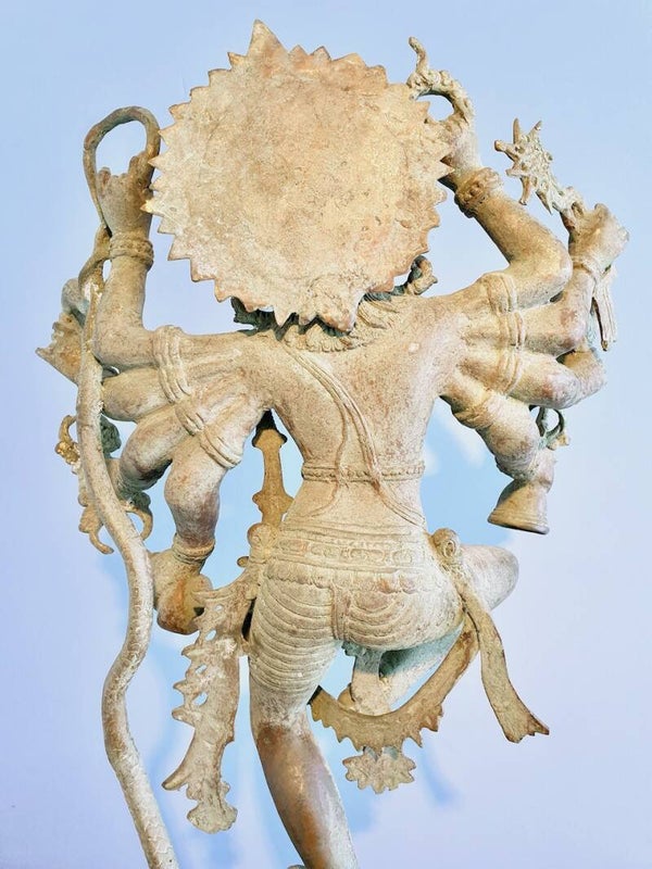Dit prachtige beeld van Shiva in volledige dans, met een stralende krans achter zijn hoofd. Zijn acht armen zijn gespreid als de zon.