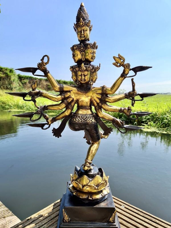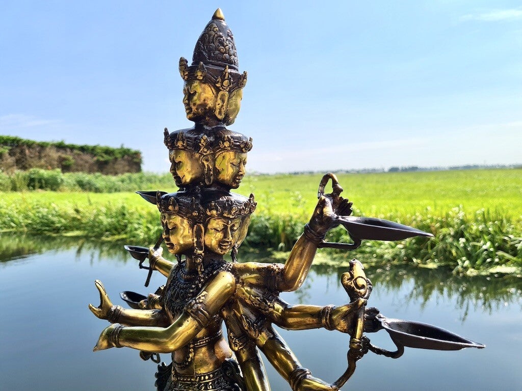 In zijn tien handen houdt hij naast acht kandelaren of schalen (niet bedoeld voor waxinelichtjes) bijvoorbeeld een pijl en boog voor zijn strijdvoering vast.