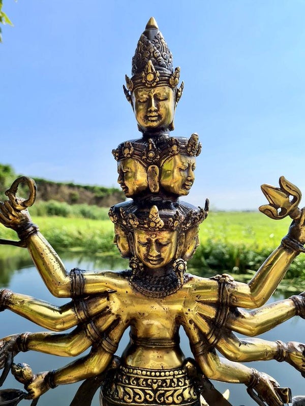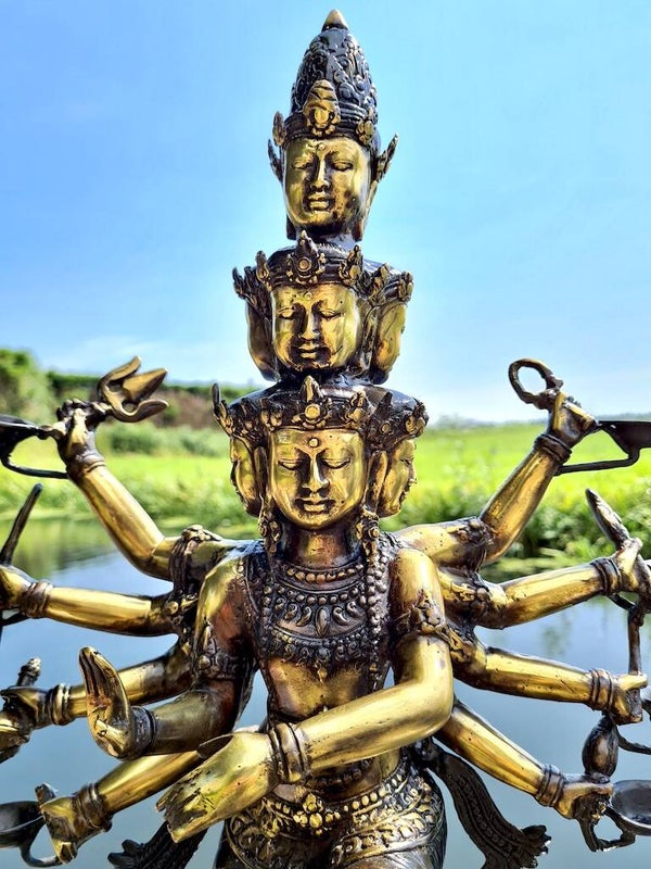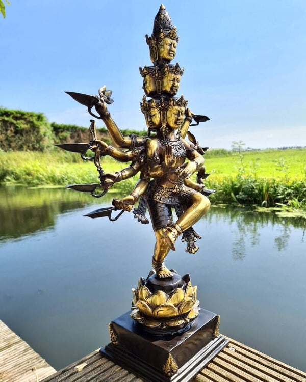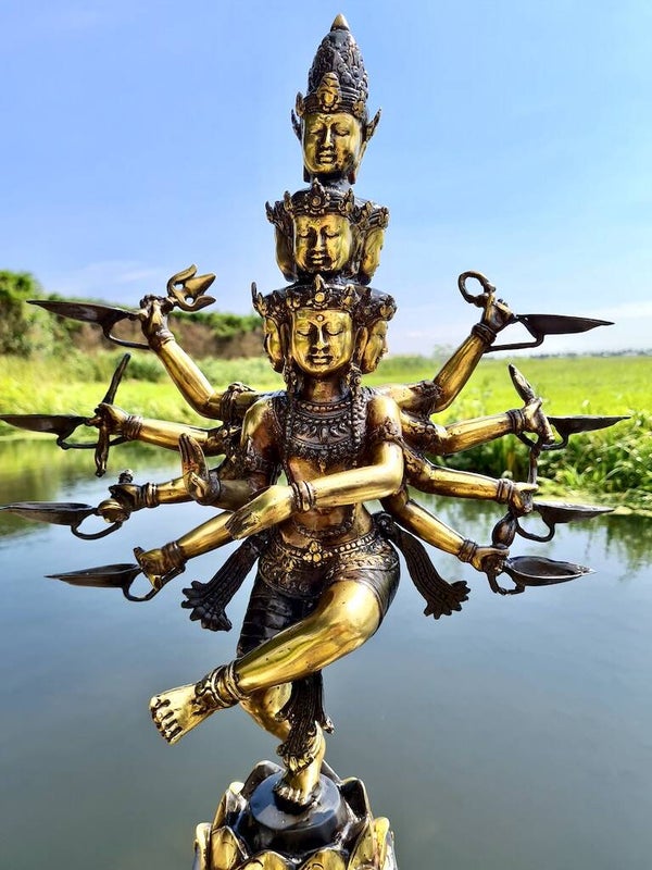 Dit prachtige beeld van Shiva in volledige dans, zijn tien armen zijn gespreid als de zon. Shiva wordt wel gezien als iemand die op allerlei manieren (door allerlei rollen aan te nemen) het welzijn bevordert. Om al die manieren of rollen vorm te geven wordt Shiva wel met verschillende gezichten afgebeeld.