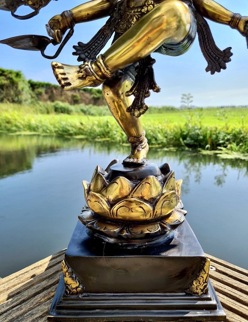Shiva heeft een bronzen basis en een mooie bruin gouden patina. Zijn linkerbeen is verhoogd door zijn dans dat de sculptuur een verfijnde uitstraling geeft. Een topstuk van Lord Shiva wat ons betreft!