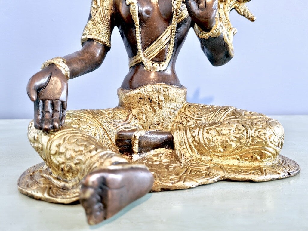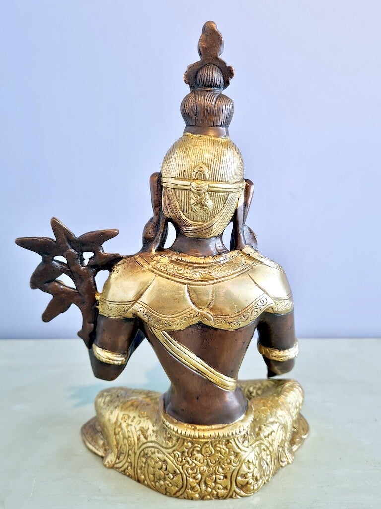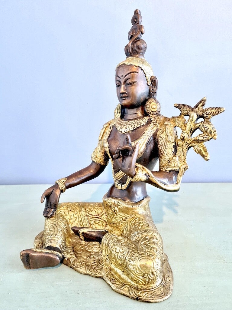 Ze is rijkelijk voorzien van sieraden, een lotusbloem en vele andere details.