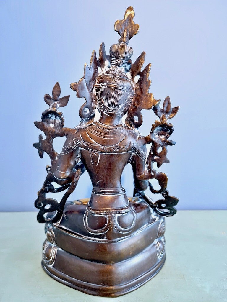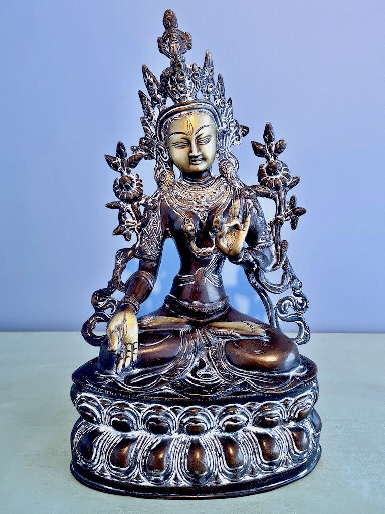 De witte Tara zit in de lotushouding en houdt de lotusbloem van het mededogen in haar linker hand. Ze brengt de toegewijde een lang leven en beschermt tegen alle gevaar. In het algemeen zorgt Tara voor Verlichting; "Zij die verlichting brengt". De witte Tara is een mooi symbool van vrede en bescherming en bevrijdt de ziel uit het rad van wedergeboorte.