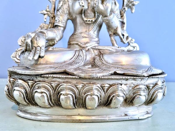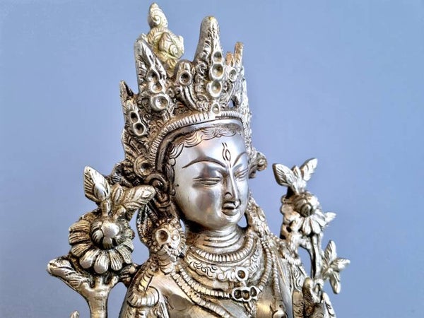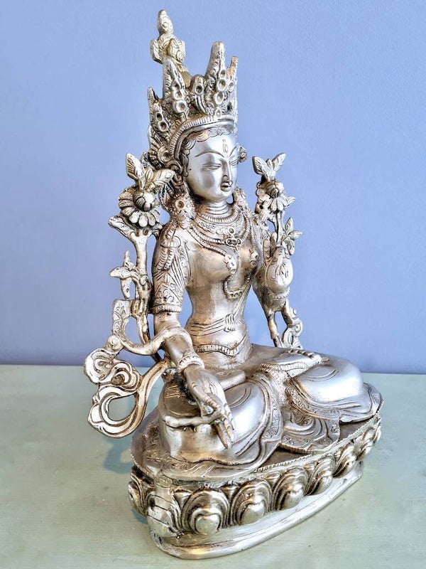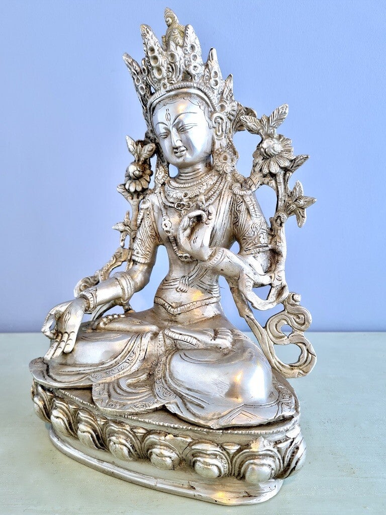 De witte Tara zit in de lotushouding en houdt de lotusbloem van het mededogen in haar linker hand. Ze brengt de toegewijde een lang leven en beschermt tegen alle gevaar. In het algemeen zorgt Tara voor Verlichting; "Zij die verlichting brengt". De witte Tara is een mooi symbool van vrede en bescherming en bevrijdt de ziel uit het rad van wedergeboorte.