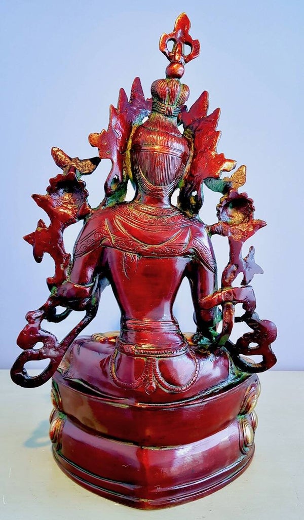 De witte Tara zit in de lotushouding en houdt de lotusbloem van het mededogen in haar linker hand. Ze brengt de toegewijde een lang leven en beschermt tegen alle gevaar. In het algemeen zorgt Tara voor verlichting; "Zij die verlichting brengt". De witte Tara is een mooi symbool van vrede en bescherming en bevrijdt de ziel uit het rad van wedergeboorte.