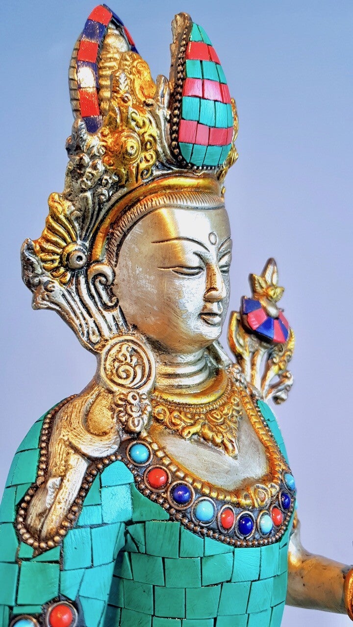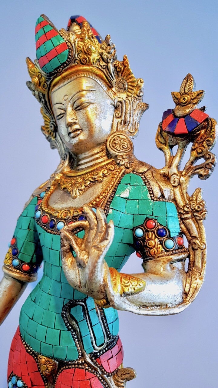 Tara is hier vertegenwoordigd in een staande positie: Samapada Asana genoemd. Ze is gekleed en gekroond als een Bodhisattva. Tara's rechterhand in Varada Mudra , haar linkerhand is in Jnana Mudra. Ze houdt de stam van de lotus op haar linker schouder. Haar haar hangt over haar schouders en ze is versierd met juwelen en staat bovenop een mooie lotus.