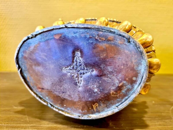 Materiaal: Koper, vuurverguld 24 k (gold plated), ingelegde gekleurde accessoires.