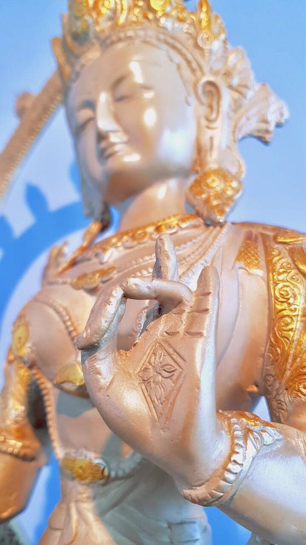 Links en rechts voorzien van twee lotusbloemen. Ze is rijkelijk voorzien van sieraden en vele bijzondere details. Ze heeft een warme beige en goudkleurige patina. Tara zit verheven op een lotusvormige basis.