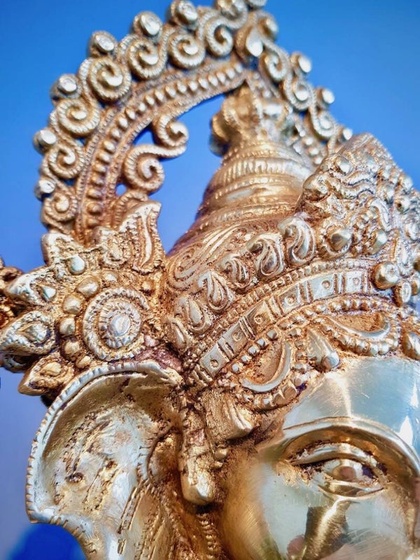 Een olifantenhoofd is groot en heeft een wijde mond, grote oren en grote ogen. De wijde mond symboliseert de aard van de mens, de wens om te genieten van het leven. De grote oren symboliseren de kwaliteit om naar anderen te luisteren. Door naar anderen te luisteren, kweken we begrip. Het hoofd van Ganesha staat dus als het ware voor wijsheid, de genietenswens van de mens en begrip. Om het tweede wordt Ganesha vooral vereerd om wensen in vervulling te laten gaan. Van olifantenogen wordt gezegd dat ze objecten groter zien dan ze werkelijk zijn. Dat symboliseert: hoe groot we ook worden, we dienen anderen altijd als groter te beschouwen dan onszelf. Dat wil zeggen dat we onze trots moeten opofferen en nederigheid dienen te bereiken.