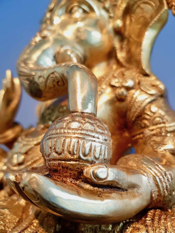 De omhoogstaande hand staat voor het geven van zegen. Ganesha geeft de toegewijden van het Goddelijke zijn zegen. Door ware toewijding zijn we in staat de zegen van het Goddelijke te ontvangen en door deze zegen kunnen wij tot het Goddelijke komen wanneer wij ons leven daarop inrichten.