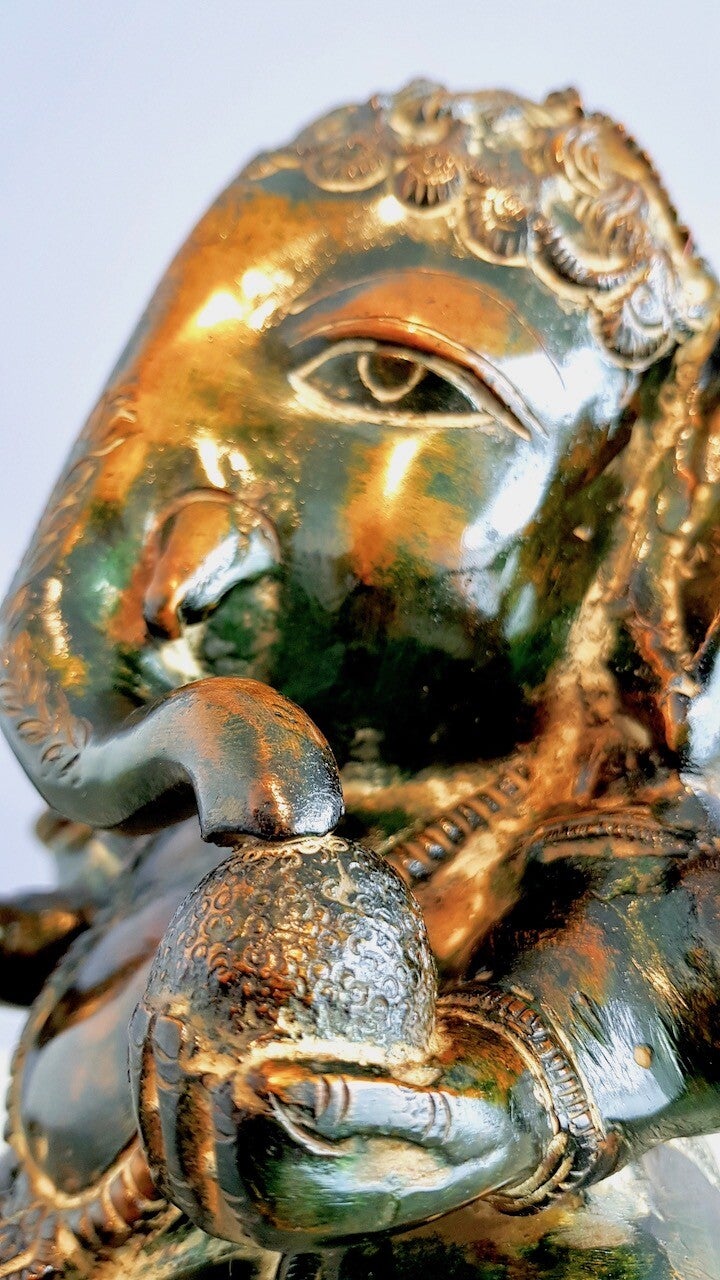 Een schattige zware baby Ganesha van 4,5 kg! Bijzonder exemplaar in zeldzame kleurstelling patina. Let op de speciale details die op het beeld zijn aangebracht.