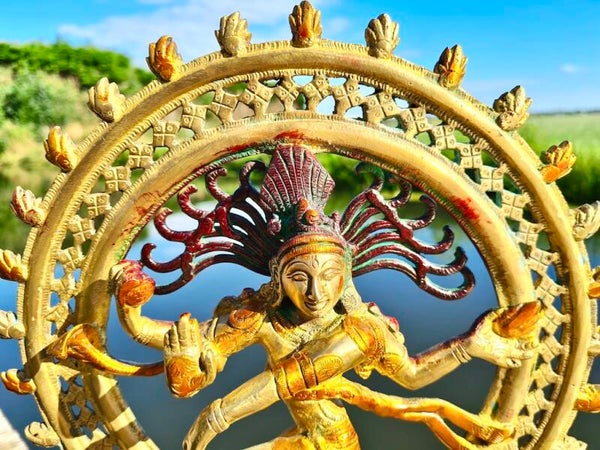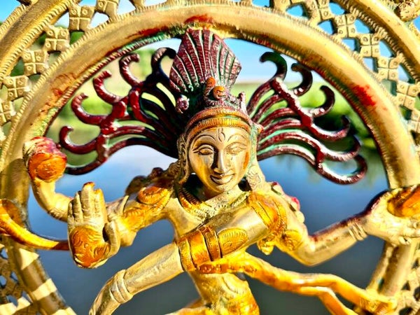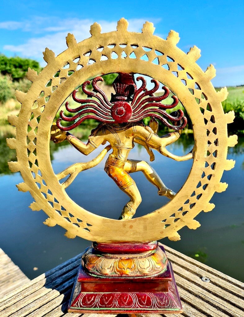 Rond het beeld een cirkel van vuur. Typische attributen van de dansende Shiva zijn het derde oog op het voorhoofd (bovennatuurlijke kracht door meditatie) en de verschillende cobra's (eeuwig leven). De twee verschillende oorringen aan linker- en rechterzijde zijn symbolisch voor de vereniging van mannelijke en vrouwelijke aspecten. Shiva's uitgespreide haren (dreadlocks) verwijzen naar zijn ascetische levensstijl. Volgens de legende ving Shiva de Ganges op in zijn haren.