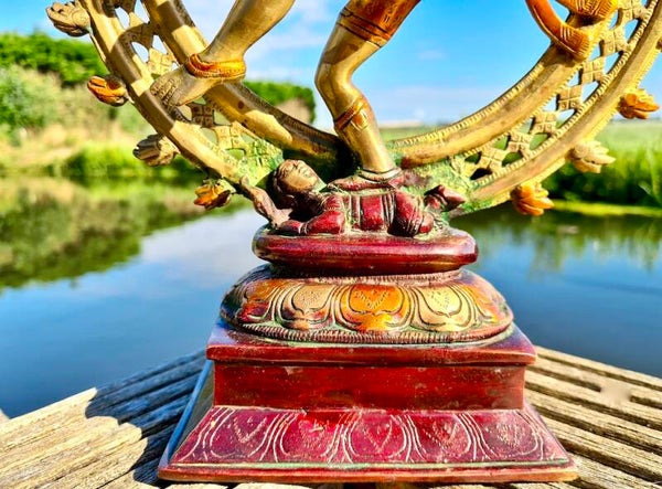 In zijn verste linkerhand houdt hij een vlam: vuur als symbool voor de vernietiging. Zonder vernietiging is geen schepping mogelijk. De tweede rechterhand houdt hij in een geruststellend, groetend handgebaar : de bekende 'Abhaya mudra', "vrees niet": deze symboliseert de instandhouding van de wereld. De tweede linkerhand wijst naar het opgeheven linkerbeen: symbolisch voor de bevrijding van illusie (wanneer God het wil). De vorm van deze arm herinnert tevens aan de slurf van Ganesha en is een symbool van kracht. De vier armen, typisch voor Indische goden, zijn natuurlijk ook symbolisch voor de almacht van Shiva. Onder zijn rechtervoet tenslotte bedwingt hij moeiteloos de dwerg-demon 'Apasmara-Purusha', de 'onwetende' of 'vergeetachtige' ziel.