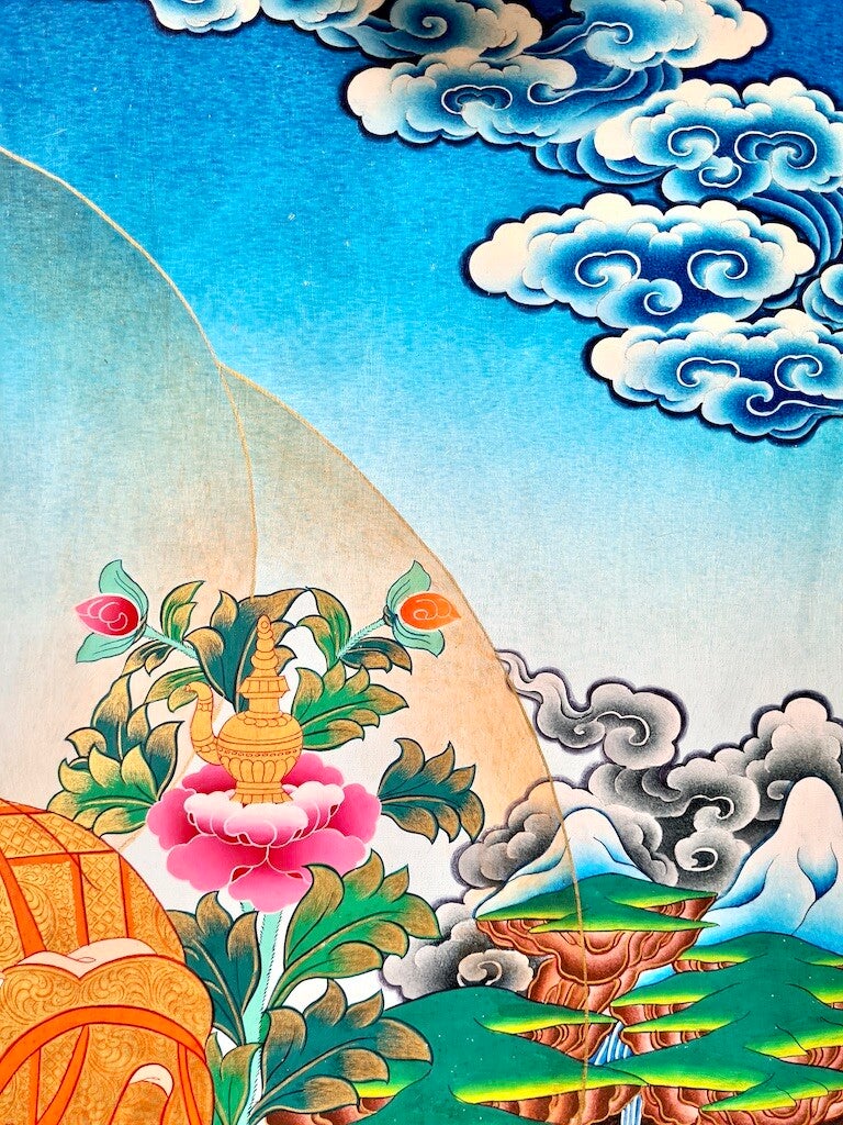 Letterlijk betekent het Tibetaanse woord thang-ka: ‘vastgelegde boodschap’. In de aloude kunst van Tibetaanse rolschilderingen hebben alle figuren en heeft elk detail zijn specifieke betekenis.