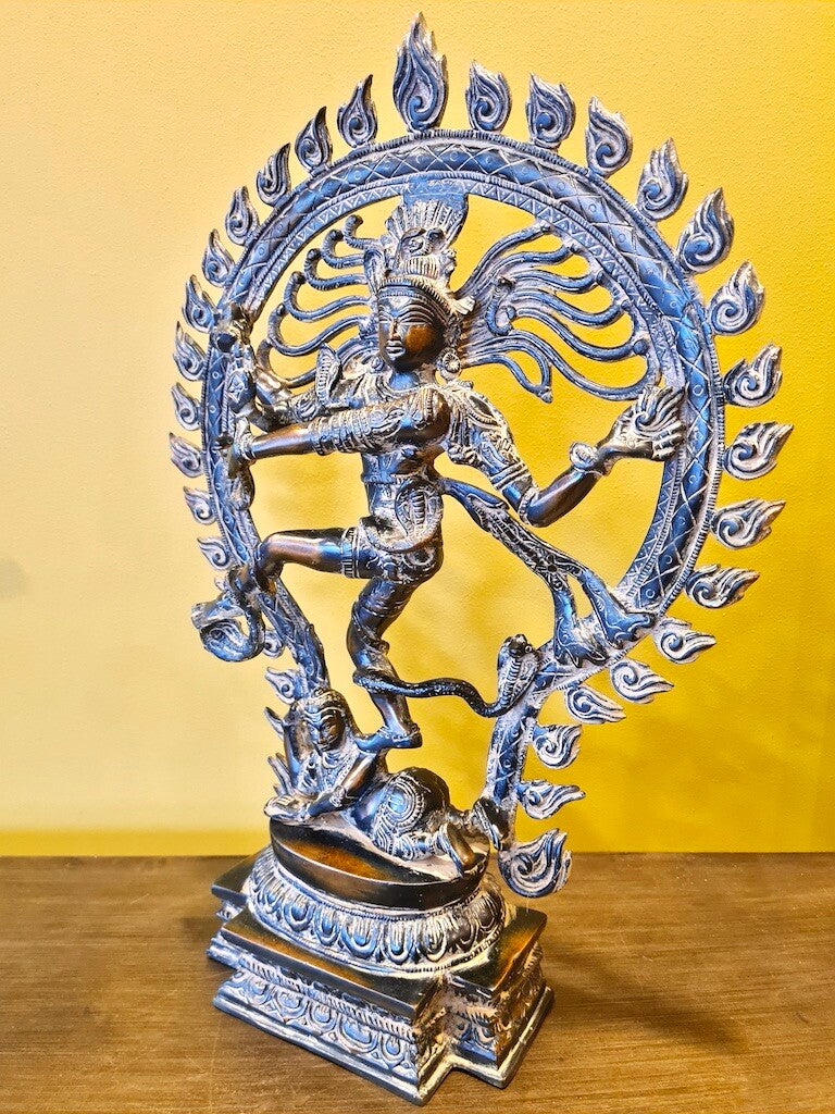 In zijn verste linkerhand houdt hij een vlam: vuur als symbool voor de vernietiging. Zonder vernietiging is geen schepping mogelijk. De tweede rechterhand houdt hij in een geruststellend, groetend handgebaar : de bekende 'Abhaya mudra', "vrees niet": deze symboliseert de instandhouding van de wereld. De tweede linkerhand wijst naar het opgeheven linkerbeen: symbolisch voor de bevrijding van illusie (wanneer God het wil). De vorm van deze arm herinnert tevens aan de slurf van Ganesha en is een symbool van kracht. De vier armen, typisch voor Indische goden, zijn natuurlijk ook symbolisch voor de almacht van Shiva. Onder zijn rechtervoet tenslotte bedwingt hij moeiteloos de dwerg-demon 'Apasmara-Purusha', de 'onwetende' of 'vergeetachtige' ziel.