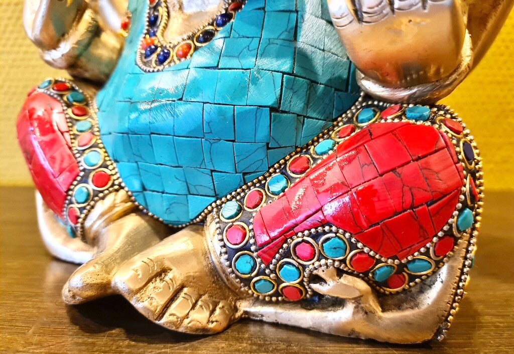 Materiaal: Brons, patina goud met ingelegde groene, rode en blauwe gepoederde steentjes en kralen. Handgemaakt.