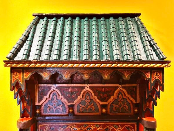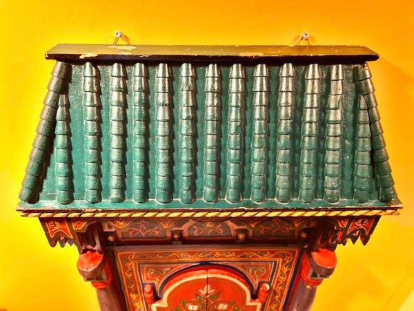 Het geheel is rijkelijk versierd en de spiegel kan worden verborgen achter twee karakteristieke tempeldeurtjes. Het dak is sierlijk en zacht groen. Een lust voor het oog!