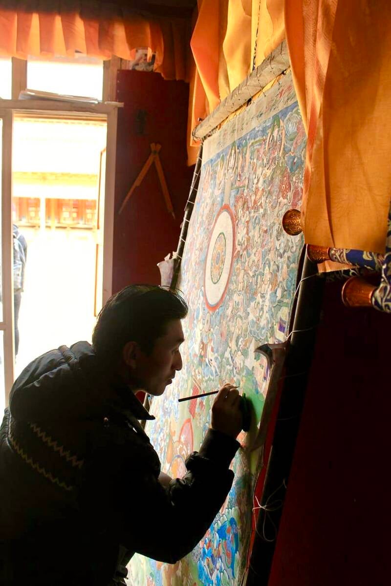 Het vereist perfecte vaardigheden in het tekenen, perfecte figuren en een groot begrip van de econometrische principes om deze schilderijen te maken. Evenwichtige rasters van hoeken en kruisende lijnen worden gebruikt om armen, benen, ogen, neusgaten, oren, en verschillende rituele werktuigen af te beelden en samen te voegen met het vlekkeloze ontwerp hemel landschap met behulp van kleurverzadiging en arcering die meer verfraaide look en stijl geeft aan het schilderij, volgens het thema. Nadat het kleurrijke ontwerp op het doek is aangebracht, geeft de ambachtsman het schilderij een laatste gouden toets. Kleine koudgouden munten en ledergom vermengd met water (geweekt tot een pasta) worden als laatste afwerking aangebracht, wat een glinsterende look geeft. De goud afwerking wordt gedaan met een borstel genaamd chew (lokale naam), die een glasvezel heeft in plaats van haar. Koud goud wordt ook wel "Ser" genoemd en komt uit China. Na het afwerken van de schildering bedekken ze het met rode en gele satijnen doeken, aangezien de kleur wordt gesymboliseerd als GOD dragen. De traditionele kunstvorm is in principe religieus en wordt uitgevoerd in harmonie met de richtlijnen die in de boeddhistische geschriften zijn vastgelegd.